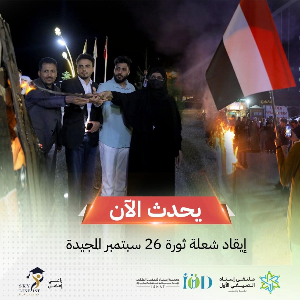 احتفل طلاب جمعية إسناد لتمكين الطلاب من أعالي جبال مدينة كوجايلي التركية بموقع ملتقى إسناد الصيفي الأول بمشاركة نخبة من اليمنيين وقادة العمل النقابي الطلابي حيث تقدمت الحضور رئيسة الجمعية الدكتورة/ أسماء القرشي وأوقدت شعلة سبتمبر وسط أجواءٍ وطنية وحماسية وهتافات سبتمبرية وثورية تغنّى بها الحاضورن تحفهم البهجة والسرور بهذه المناسبة العظيمة التي تحل على شعبنا المجاهد وهو يصارع قوى الإمامة والرجعية التي عادت من جديد.